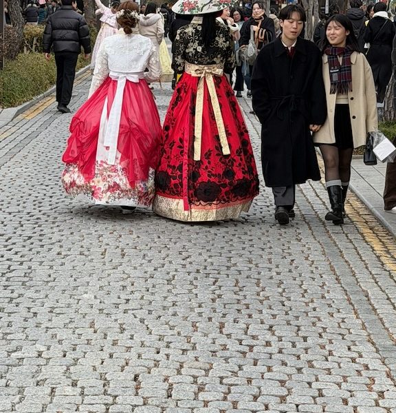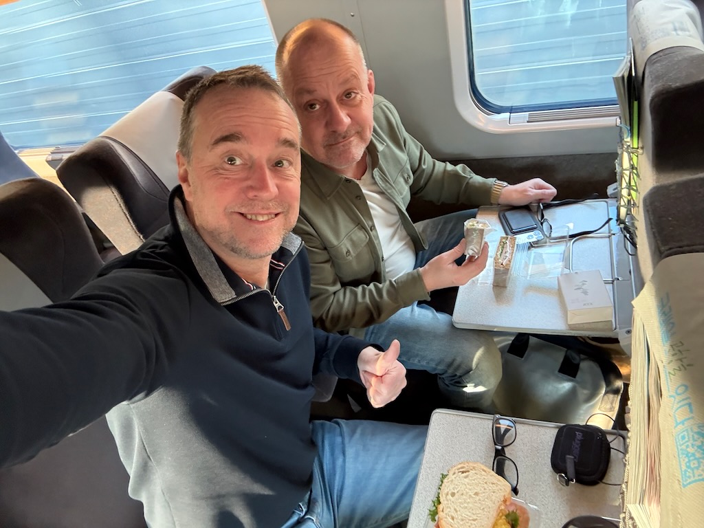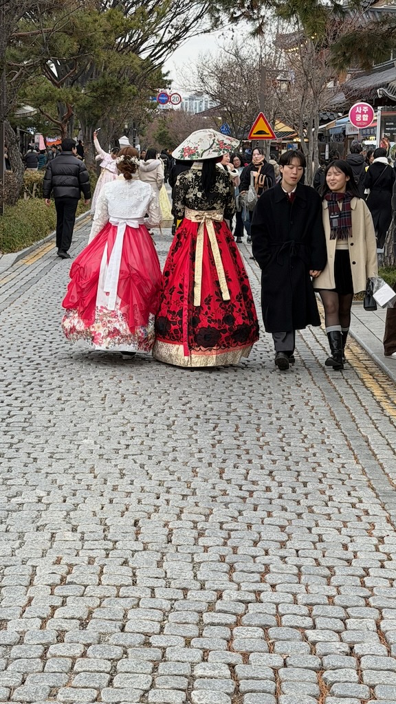 Behalve de eerste treinmachinist van vandaag, zijn de Koreanen zeer punctueel en drie uur inchecken, betekent drie uur inchecken. Gelukkig konden we onze koffers en tassen wel achterlaten en ontdekken we het dorp op ons gemak. Het weer is prachtig; zonnetje, windstil, boven het vriespunt. Ideaal voor een kop koffie op het terras en, soms traditioneel geklede, mensen kijken.