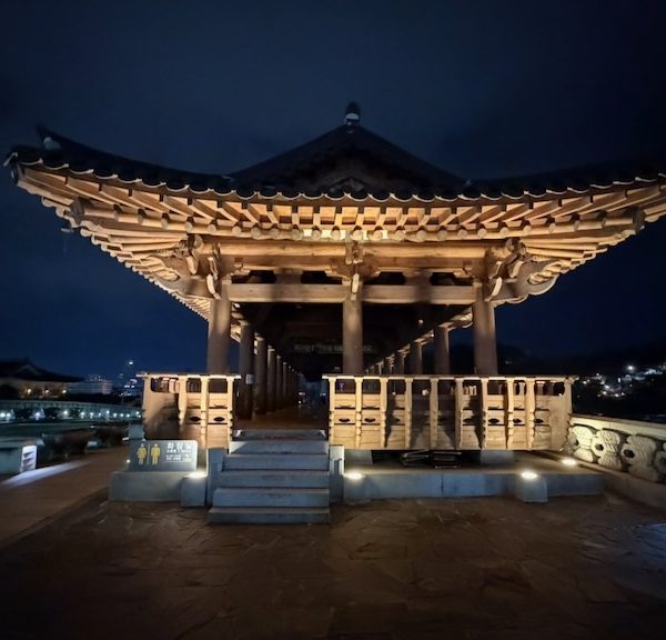 Vandaag slapen we weer in een hanok, de traditionele Koreaanse woning, die gelegen is in de grootste, nog bestaande, Hanok dorp van Zuid Korea. Dit gegeven is een van de redenen waarom we deze stop hebben ingepland. Het Hanok dorp is op zondag afgesloten van verkeer en daarom moeten we de laatste 500 meter lopen met onze bagage. Op zich geen probleem, maar het is een behoorlijke klauter naar de brug over de snelweg, om vervolgens stapje voor stapje af te dalen naar de rand van het dorp.