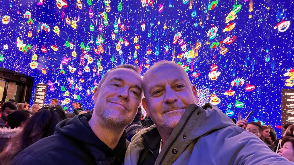 Rest ons nog wat foto’s. Waarvan één niet van deze tegenwoordige tijd is. We doen deze reis niet voor niets, daarom af een een trip down to memory lane. We hebben wat te vieren en daarom is de hoofdfoto van dit verhaal een kerstfoto uit 2023; genomen rondom kerst in London en specifiek de grootste Oled scherm/kubus gelegen nabij Tottenham Court Station, tegenover waar ooit het Astoria theatre stond, lang, lang geleden. Zegt de meeste mensen niets, maar voor ons en paar anderen een bekende plek.