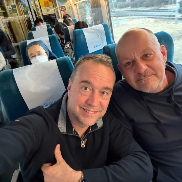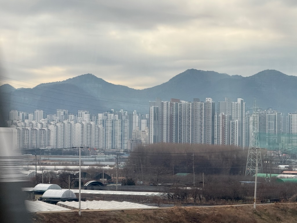 Een rit die ons een eerste indruk van Korea geeft. Overigens weigeren ze hier over Zuid Korea te spreken; ze spreken hier over Korea als één land. Dat doen ze in het land van Kim Jong Un, wat wij kennen als Noord Korea, ook. Over de indruk gesproken, nou die is niet al te best. Toegegeven, het is winter. Geen bladeren aan de bomen en vandaag is ook nog eens een grijze dag. Die grijze kleur past prima bij de enorme betonnen flats, waar er wel 20 van bij elkaar staan, en die dan steden in dit land vormen. Zelfs de Bijlmer in Amsterdam is kleurrijker, behalve dan die betonnen badkuip die daar vlakbij het station staat.