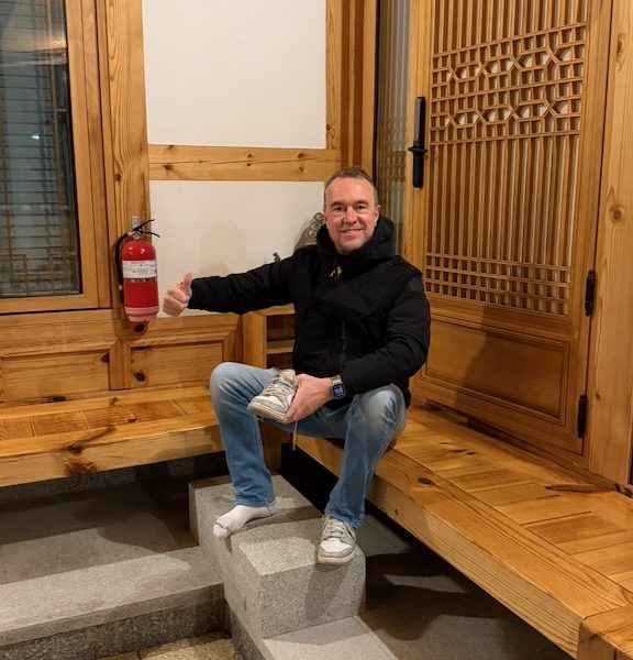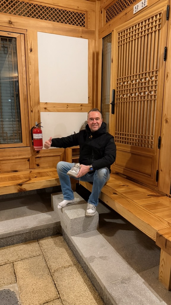 Een treinreis die ons na ruim twee uur, via 5 stations, verder een taxirit van 12 kilometer, bij onze Hanok weet te brengen. Een Hanok is een traditionele Koreaanse (Han) woning (ok); Hanok. Je mag geen schoenen aanhebben, matrassen op de grond, een Ikea jaren ’70 interieur, voorzien van alle technische snufjes en een bad van 9 vierkante meter groot. Ooit in 2017, in Japan, hebben we een kamer gehad met dezelfde afmeting. Helemaal prima dus. Ook worden we nog eens zeer welkom geheten door de eigenaren en in gebrekkig Engels weten ze wel alle technische snufjes uit te leggen. Overigens die technische snufjes behelsen niet een gezellig gedimd lichtje. Nee, het zijn net geen TL balken, maar het licht is net zo vreselijk.