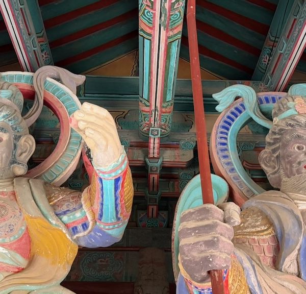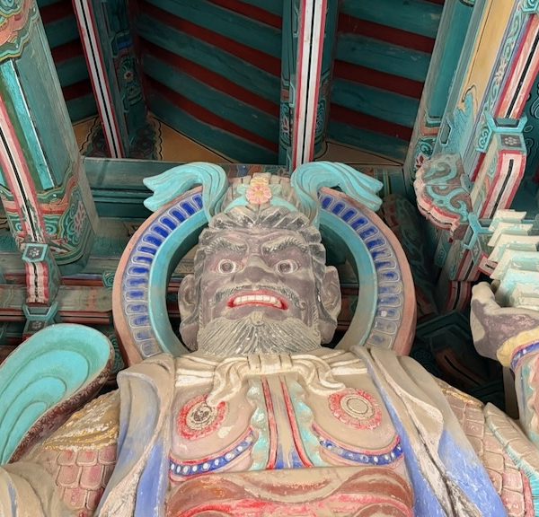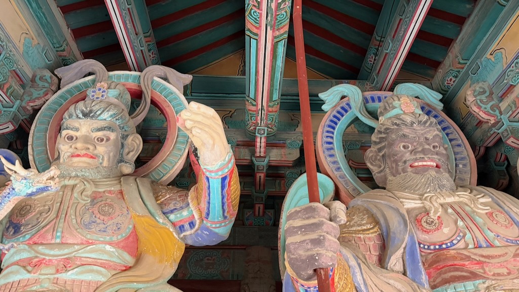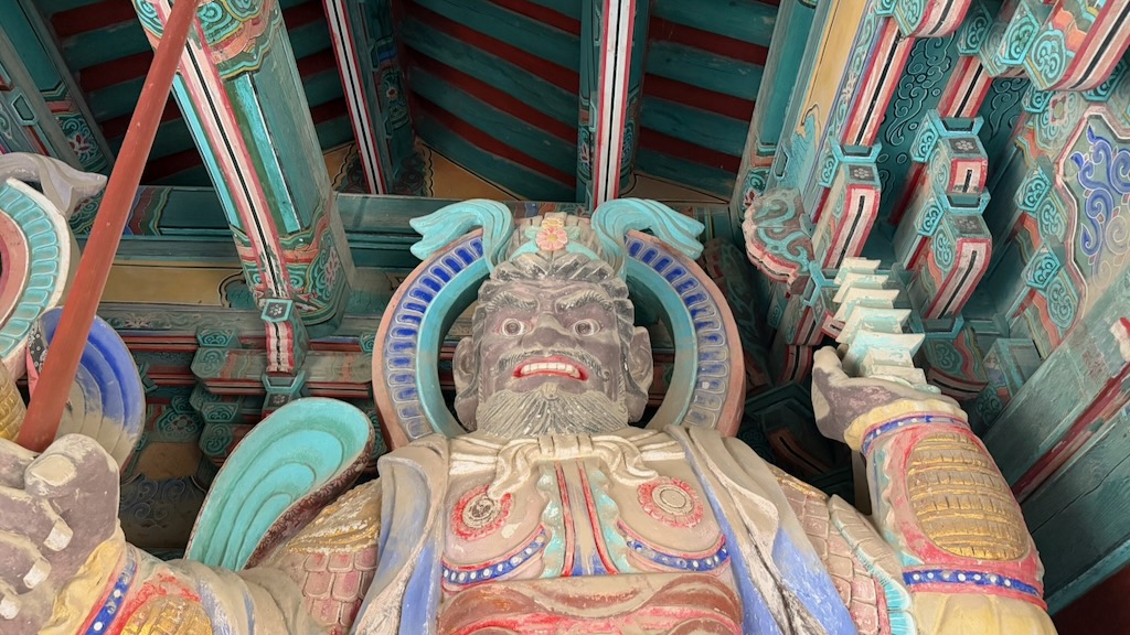 Net als veel buurlanden was/is Korea Boeddhistisch en de meest nabij gelegen, maar ook de belangrijkste, tempel hebben we bezocht met gebruikt van een halfuur durende taxi, en weer terug. Daar ligt de Bulguksa tempel, bewaakt door stoere wachters in de vorm van nors-kijkende mannen in houtvorm schuilend onder een pagode.