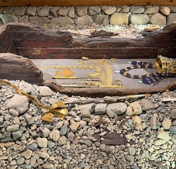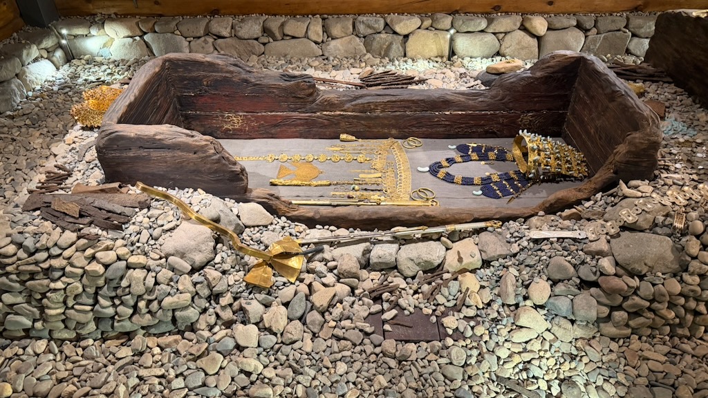 Het complex is prachtig, maar minder groot in tijd, dan de tijd die we spenderen om daar heen en weer terug te rijden. Zo zijn we anderhalve uur later terug in de oude hoofdstad. Die vooral wordt opgeluisterd door de vele grafheuvels die de vele koningen en hoogwaardigheidsbekleders van deze dynastie herbergen. We mogen en kunnen zelfs zo’n grafheuvel, weliswaar uitgegraven, bezoeken. Overigens zijn er hier tientallen van deze heuvels, die ontelbare schatten herbergen. Dat blijkt alleen al uit de enige die ze hebben uitgegraven. En het is heiligschennis om deze heuvels op te klimmen, het kan je een gevangenisstraf opleveren van 2 jaar. En daarmee wordt de grap van Robert gisteren in een ander daglicht geplaatst; Je kan er vanaf skiën met een beetje sneeuw. De barman kon er om lachen, maar de realiteit zou zomaar anders kunnen zijn.